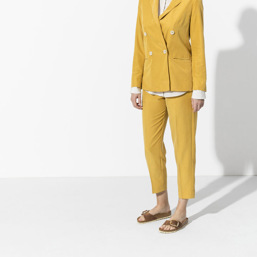 Het BIRKENSTOCK model Madrid is een echte klassieker die met zijn puristische design de modewereld inspireert. De variant Big Buckle is voorzien van een grote, elegante gesp – een mooie, opvallende blikvanger op de verder zeer eenvoudig vormgegeven sandaal. De dekzool van het semi-Exquisite-voetbed is gedeeltelijk bekleed met zacht glad leer in een bijpassende kleur. Het bovenwerk bestaat uit zeer dik, geolied nubuck met onafgewerkte randen.